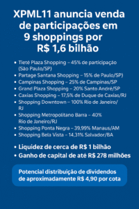 A alienação segue a estratégia do XP Malls de manter participações minoritárias em ativos relevantes, administrados pelos principais players do setor, além de reciclar ativos que perderam representatividade no portfólio. 👉 Confira mais detalhes neste vídeo: XPML11 dividendos e venda de shoppings dos proprios gestores do fundo,